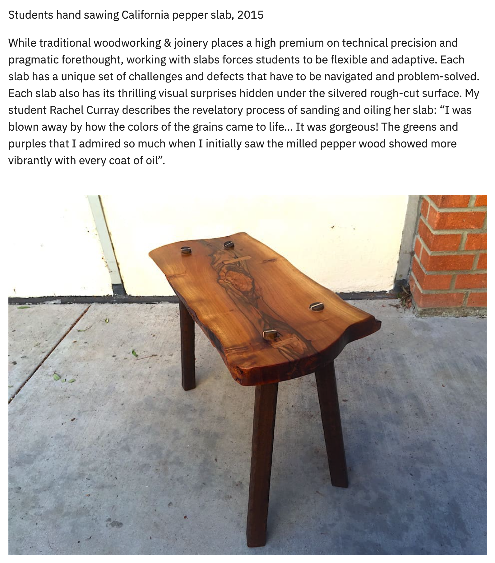 I built this bench as a student in 2015 and it continues to function in my daily life as a study bench for both pets and humans. Cleanly finished planes and deliberate joinery coexist with live edges cracks and exposed knots emphasizing honesty in construction and legibility of process. The piece reflects my interest in sustainability material ethics and the idea that design gains meaning through continued use and long term engagement.